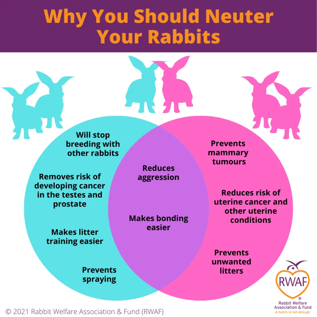 All rabbits should be neutered. This reduces the risks of cancers in both genders, prevents territorial marking and can help reduce aggression, as well as preventing unwanted litters. We take in so many kits every year due to missexed rabbits, rabbits that have gotten out of their enclosures and rabbits that have bred between cage bars (yes, that happens!).